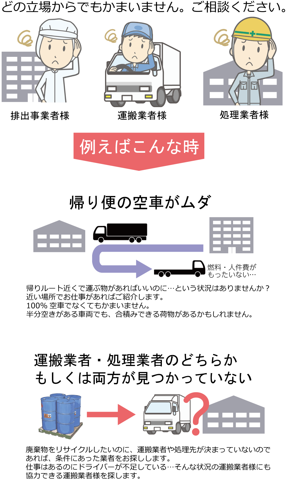 条件の合う空車トラックに荷物を載せて運べないか、という要望に応えて会社を越えて仕事と車両をマッチングすることで、お互いにメリットを生み出します。
